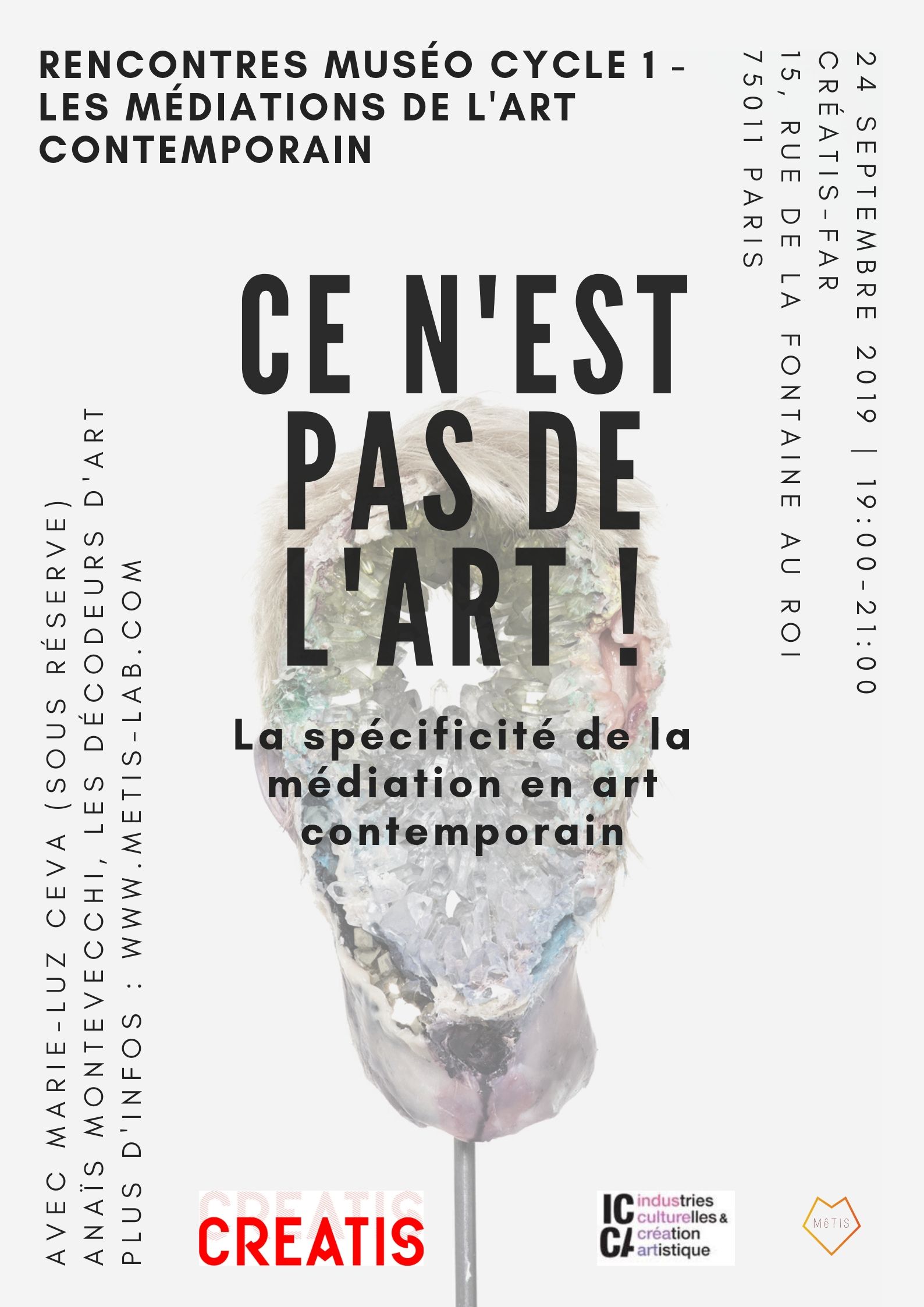 «Ce n’est pas de l’Art !»: une phrase trop souvent entendue à l’entrée d’une galerie ou d’un musée, une exclamation lâchée face à un white-space quasi vide, une performance excentrique, un tableau trop abstrait. «Ce n’est pas de l’Art !» fait référence à la possible difficulté d’accès à certaines oeuvres d’art contemporain. «Ce n’est pas de l’Art !» inaugure le cycle de quatre rencontres consacrées à l’art contemporain et à sa médiation. Ainsi, comme introduction à ce cycle, les intervenant.e.s discuteront, de l’accessibilité à l’art contemporain, de la spécificité de sa médiation et exploreront ensemble les diverses possibilités de médiation.